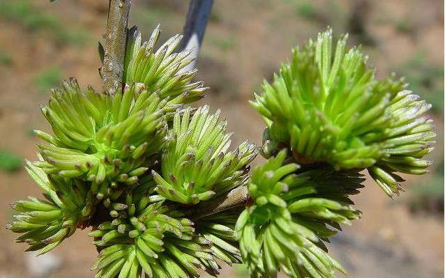 花生于当年枝基部,雄花无花被;花梗长约3毫米,无毛;苞片倒卵状匙形, 长6-8毫米,顶端圆形,边缘有睫毛,早落;雄蕊长约1厘米,无毛,花丝长约1毫米,药隔突出,花粉囊细长,无退化雌蕊。雌花单生,苞片倒卵形,花梗长8 毫米,子房无毛,1室,扁而长,先端2裂,子房柄极短。翅果扁平,长椭圆形,长3-3.5厘米,宽1-1.3厘米,先端2裂,基部楔形,周围具薄翅。