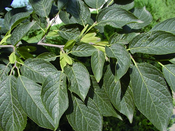叶椭圆形、卵形或矩圆形,薄革质,长6-15厘米,宽3.5-6.5厘 米。基部圆形或阔楔形,先端渐尖;上面暗绿色,初时有褐色柔毛,不久变秃净,老叶略有皱纹,下面淡绿,初时有褐毛,以后仅在脉上有毛。侧脉6-9对,与网 脉在上面下陷,在下面稍突起,边缘有锯齿,叶柄长1-2厘米,上面有槽,被散生长毛。
